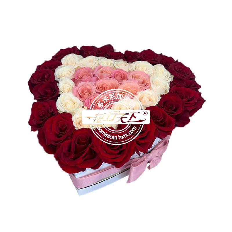 红、白、粉三种进口顶级玫瑰组成心型、礼盒装.